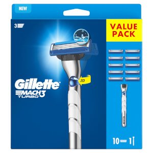Experience Gillette’s famous 3-blade shave with a literal twist. The world’s No. 1 3-bladed razor* is available with a 3D Motion handle that provides expert precision on contours. This value pack includes 1 Mach3 Turbo 3D Motion razor in a sustainable cardboard box and 9 replacement cartridges. Get all you need for a classic smooth shave and stock up on replacement cartridges at the same time!