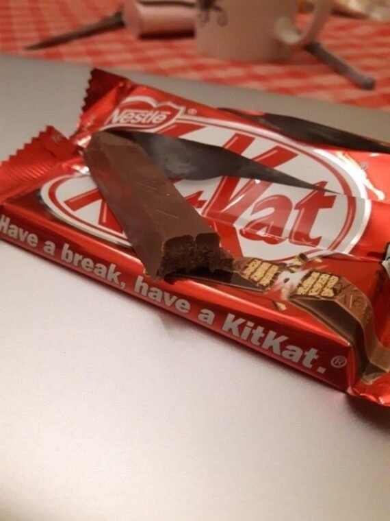 Kit Kat is a chocolate-covered wafer bar confection created by Rowntree’s of York, United Kingdom, and is now produced globally by Nestlé, which acquired Rowntree in 1988,with the exception of the United States where it is made under license by H.B. Reese Candy Company, a division of The Hershey Company. The standard bars consist of two or four fingers composed of three layers of wafer, separated and covered by an outer layer of chocolate. Each finger can be snapped from the bar separately. There are many different flavours of Kit Kat, including milk, white, and dark chocolate.